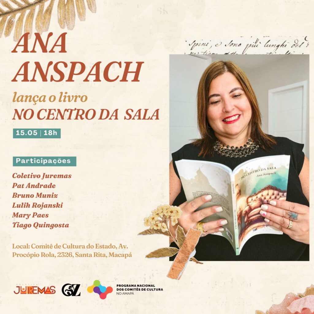 A Poeta e publicitária Ana Anspach, retorna ao cenário literário com o lançamento de seu segundo livro de poemas, intitulado No Centro da Sala, publicado pela Editora O Zezeu. O evento de lançamento acontecerá no dia 15 de maio, das 18h às 21h, no Comitê de Cultura do Estado, localizado na Av. Procópio Rola, 2326, Santa Rita, Macapá.