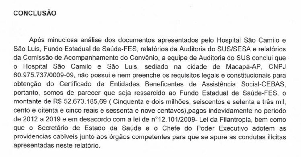De acordo com o relatório, a análise foi feita com base em documentos apresentados pelo hospital, pelo Fundo Estadual de Saúde (FES), por relatórios da Auditoria do SUS/SESA e da Comissão de Acompanhamento do Convênio. Após a avaliação, a equipe de auditoria concluiu que a unidade hospitalar não preenche as exigências previstas na Lei nº 12.101/2009, que regula a certificação de entidades filantrópicas.