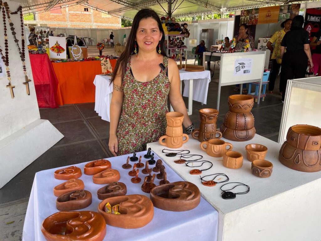A artesã Ana Cleide Carvalho, que mora em Mazagão, faz parte da Associação dos Artesãos Tribo das Artes Mazaganense (Asartam), relata que junto as consultorias do Sebrae em 2023, trabalhou com a tábua de frios, e agora em 2024, com as máscaras.
