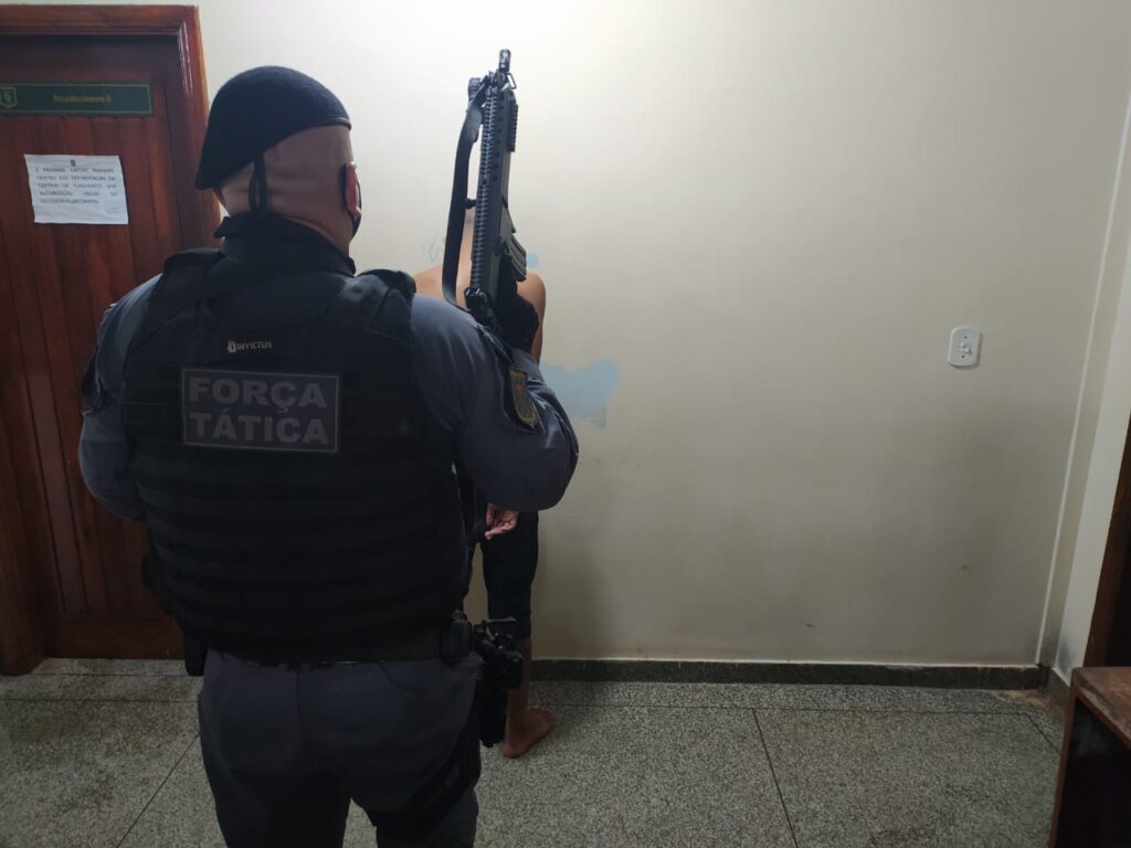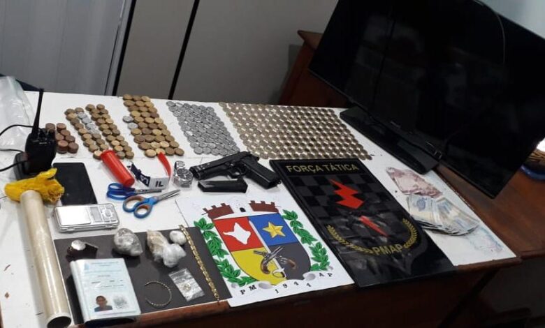 Durante as buscas pessoais, realizada no preso, os militares encontraram em sua cintura, um simulacro de arma de fogo, do tipo pistola e um carregador. Em um dos bolsos da bermuda dele, foram encontradas porções de substâncias entorpecentes.