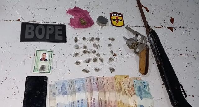 Com Rômulo Sacramento Maciel, de 22 anos, a equipe da Ronda Ostensiva Tática Motorizada (Rotam) encontrou duas armas de fogo, substâncias entorpecentes e dinheiro. O mesmo foi flagrado no bairro Congós, na zona de Macapá.