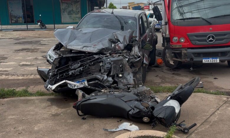 Segundo informações apuradas no local, um caminhão teria avançado a via preferencial e colidido violentamente com uma caminhonete modelo Hilux. Com a força do impacto, a Hilux acabou sendo arremessada e atingiu uma motocicleta que estava parada, aguardando para atravessar a avenida.