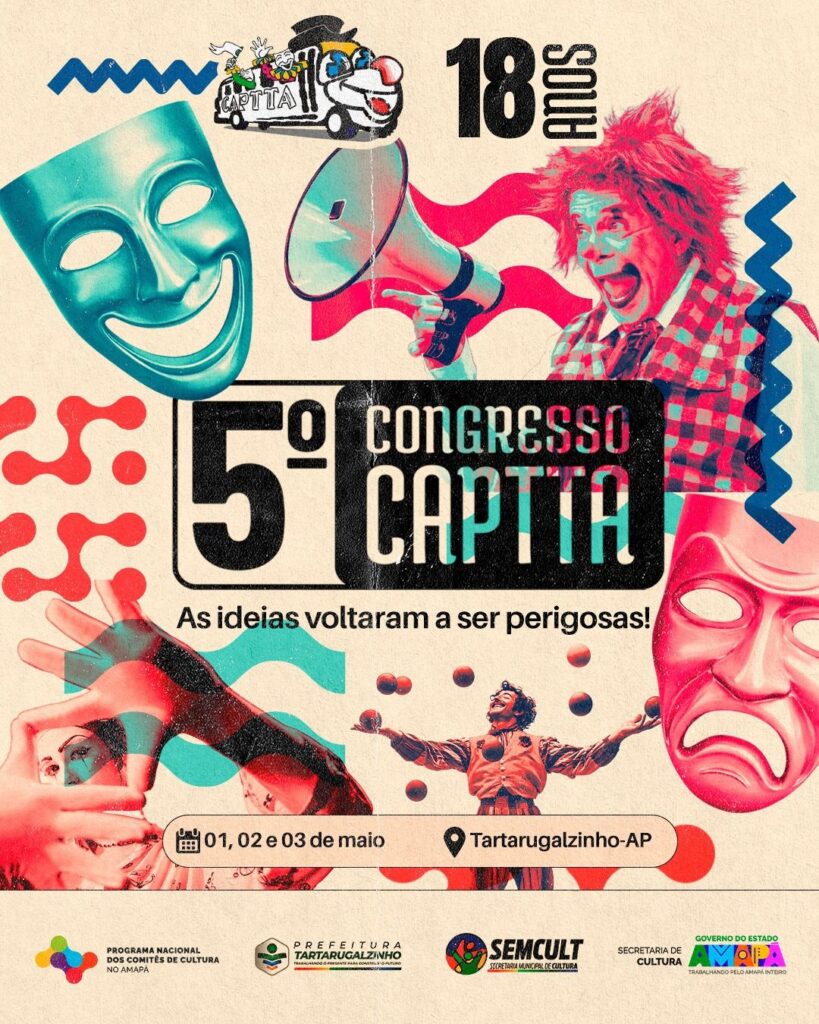 O Coletivo de Artistas, Produtores e Técnicos em Teatro do Estado do Amapá (CAPTTA) realiza, de 1º a 3 de maio de 2026, o 5º Congresso da entidade. Este ano com edição no município de Tartarugalzinho a programação reúne grupos locais, artistas, produtores e técnicos em teatro para promover a troca de experiências, discutir os desafios do setor cultural e eleger a nova diretoria do coletivo.