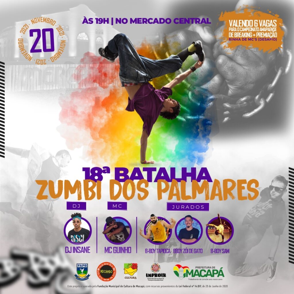 Movimento Hip-Hop celebra o Dia da Consciência Negra com a “18ª Batalha Zumbi dos Palmares”, realizado pela Federação Amapaense de Breaking (FAPB), em parceria com o Instituto Cultura VIVA, às 19h, neste sábado, 20, em frente ao Mercado Central.