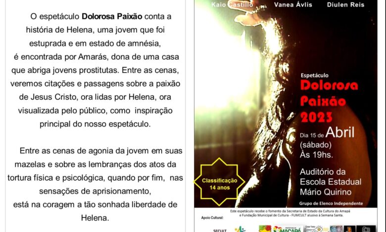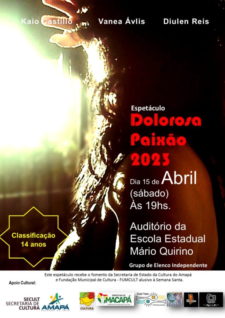 Um grupo de elenco independente, composto pelos artistas Kaio Castillo, Vanea Avlis e Diulen Reis vai apresentar o espetáculo “Dolorosa Paixão 2023”. A apresentação vai ocorrer no próximo sábado, 15, a partir das 19h, no auditório da Escola Estadual Mário Quirino.