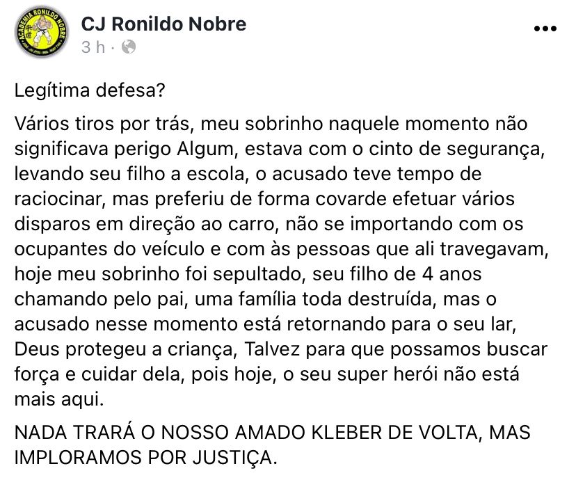 Essa versão do atirador é contestada pela família e amigos da vítima. “Vários tiros por trás, meu sobrinho naquele momento não significava perigo algum, estava com o cinto de segurança, levando seu filho para a escola, o acusado teve tempo de raciocinar, mas preferiu de forma covarde efetuar vários disparos em direção ao carro. Não se importou com os ocupantes do veículo e com às pessoas que ali trafegavam. Hoje meu sobrinho foi sepultado, seu filho de 4 anos chamando pelo pai, uma família toda destruída, mas o acusado nesse momento está retornando para o seu lar. Deus protegeu a criança, talvez para que possamos buscar força e cuidar dela, pois hoje, o seu super herói não está mais aqui”, relatou Ronildo Nobre, tio da vítima em sua rede social.