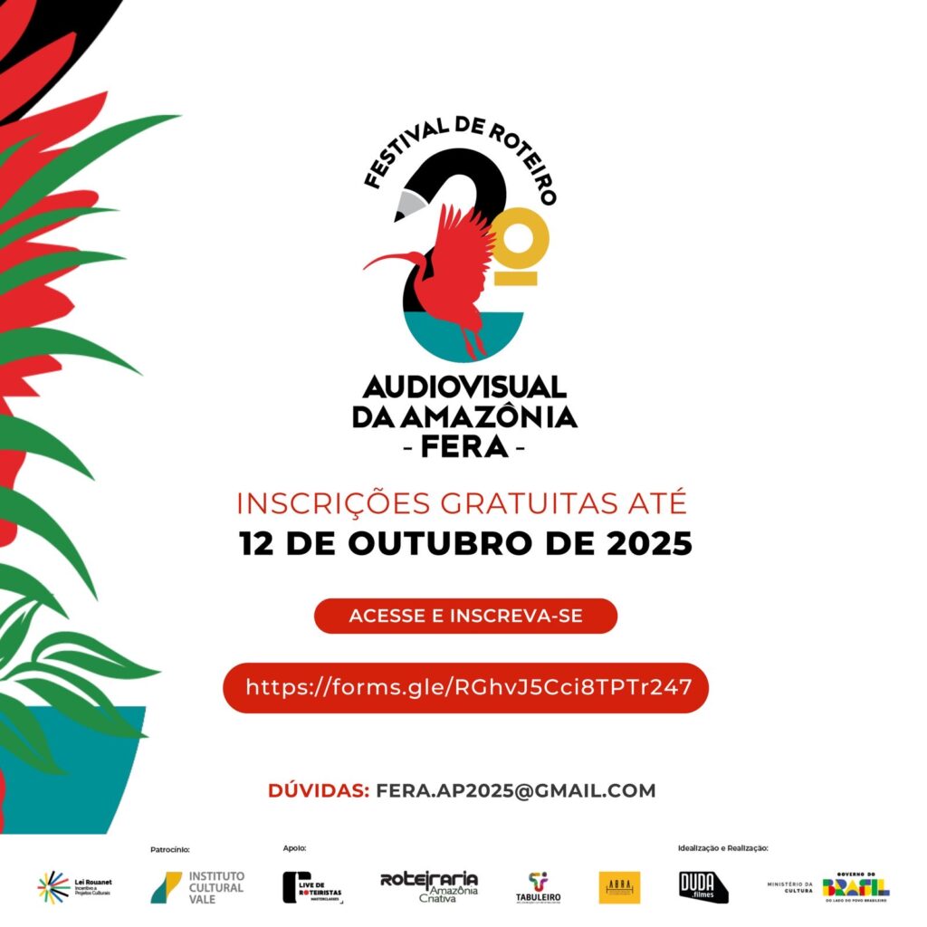 Estão abertas até o dia 12 de outubro as inscrições para o 2º FERA – Festival de Roteiro Audiovisual da Amazônia, evento que busca valorizar e impulsionar o talento de roteiristas da Região Norte do Brasil. Nesta edição o FERA reafirma seu compromisso de fortalecer o audiovisual amazônico, criando espaço para que novas vozes e narrativas da floresta, dos rios, das cidades e da diversidade cultural da região alcancem projeção nacional.