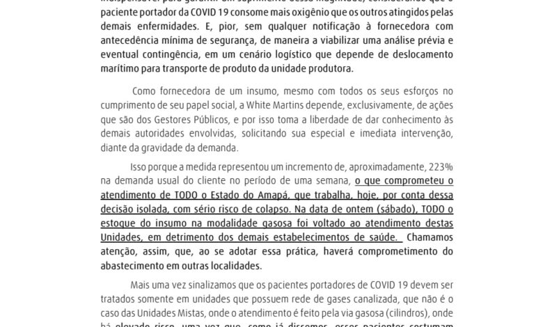 Em nota, a Prefeitura de Macapá informou que, devido a abertura de novos leitos de estabilização nas unidades de atendimento aos casos de Covid -19 da rede municipal de saúde, a empresa White Martins, fornecedora de cilindros de oxigênio, alegou dificuldades para suprir o aumento da demanda.