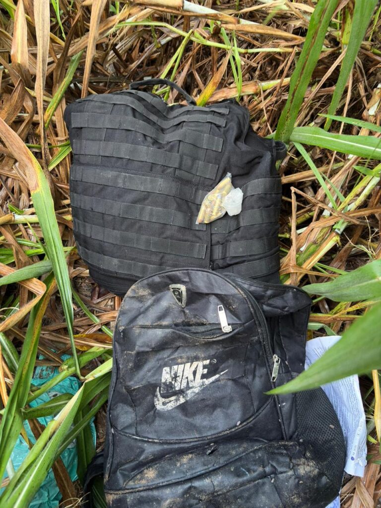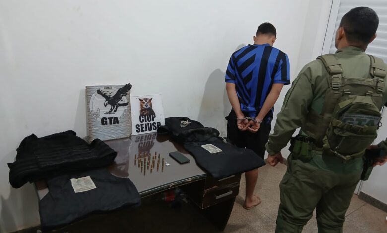 Durante a abordagem, o homem indicou aos policiais onde parte do material estava escondida. Em uma construção abandonada ao lado da residência dele, dentro de uma mochila preta, foram encontrados um colete balístico, munições de calibres .40 e .38, sendo parte de uso restrito, além de um aparelho celular e uma porção de entorpecente.