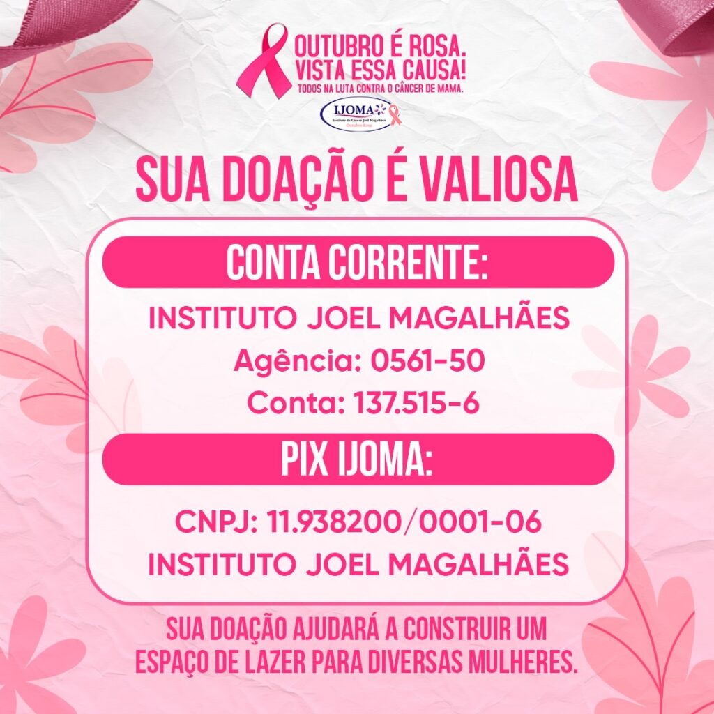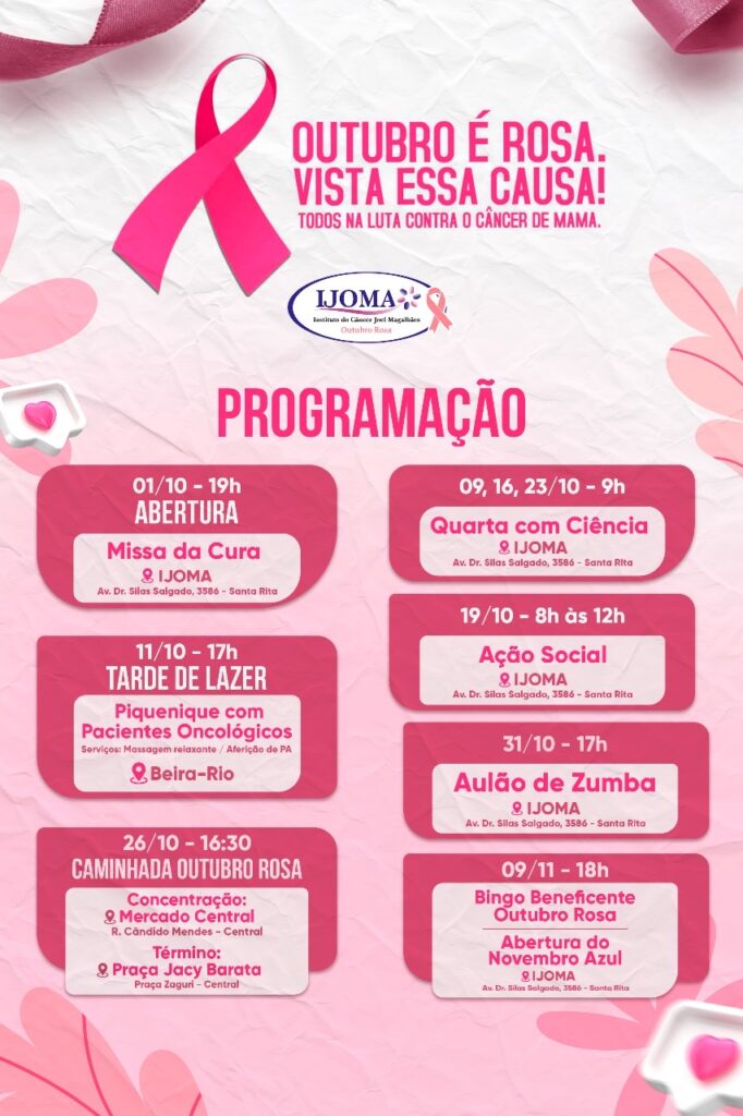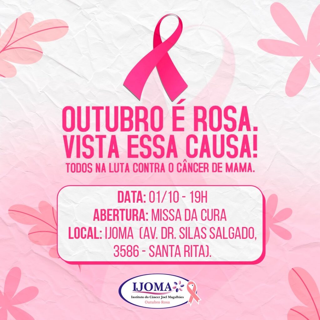 O Instituto de Prevenção ao Câncer Joel Magalhães (IJOMA) convida a todos para se unirem à causa do Outubro Rosa 2024, uma campanha de conscientização e prevenção ao câncer de mama. Este mês é dedicado a fortalecer a importância do diagnóstico precoce, do cuidado com a saúde da mulher e da luta contra o câncer. A programação inclui atividades voltadas para o bem-estar, informação e solidariedade, e está aberta a toda a comunidade.