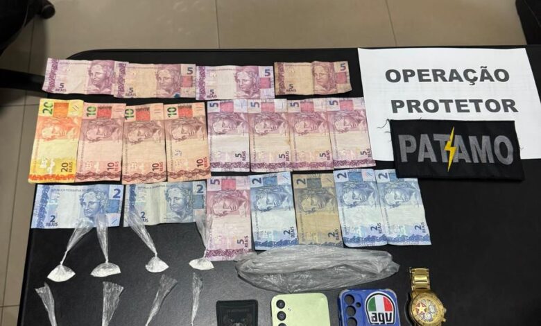 Na busca pessoal, foram encontradas 16 porções de substância supostamente entorpecente, além de R$ 107 em dinheiro, que estavam nos bolsos da bermuda. Segundo a polícia, o próprio menor afirmou que estava comercializando as substâncias no local.