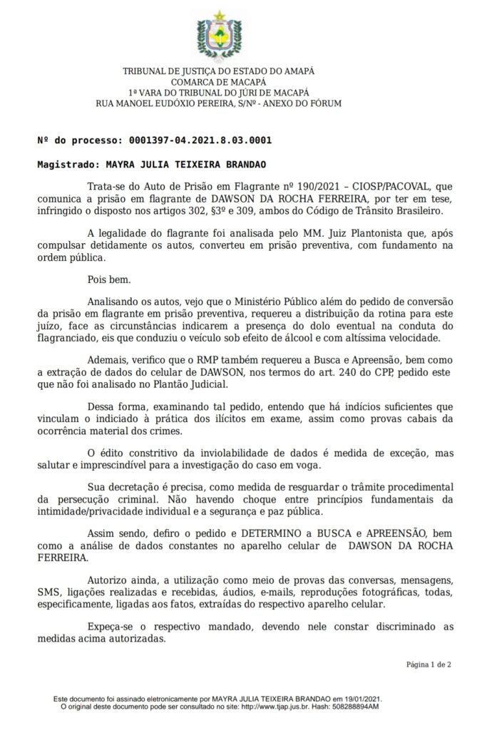 O celular do motorista Dawson Rocha Ferreira, de 39 anos, principal acusado de ter causado o acidente que vitimou dois trabalhadores na noite de sexta-feira, 15, num grave acidente no Santa Rita, teve a busca e apreensão decretada pela justiça. A homologação foi da juíza Mayra Brandão.