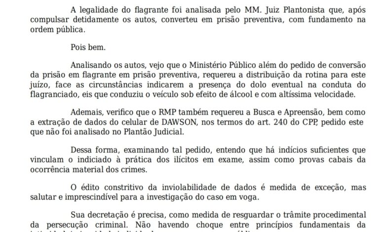 Dawson teve a prisão em flagrante decretada pelo delegado Leonardo Alves, que apura o caso, ainda no sábado, 16, após sair do Hospital de Emergências (HE).