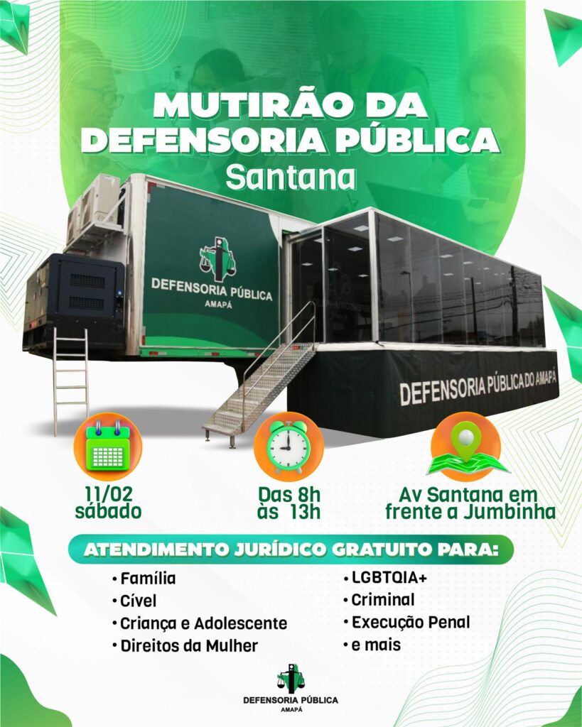 A carreta de atendimento móvel da Defensoria Pública do Amapá (DPE-AP) vai estacionar no município de Santana neste sábado, 11, com atendimentos jurídicos gratuitos à população, com os Núcleos de Família, Cível, Criança e Adolescente, Direitos da Mulher, LGBTQIA+, Criminal, Execução Penal e outros.