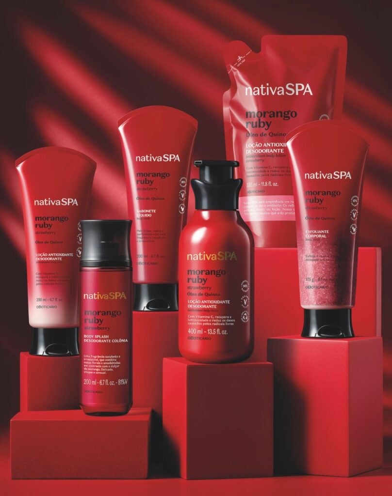 Composta por loção corporal (disponível em três volumetrias), esfoliante corporal, sabonete líquido, body splash, shampoo e condicionador, Nativa SPA Morango Ruby é aliada da consumidora que busca por uma linha de uso diário para garantir a manutenção da luminosidade da pele e proporcionar nutrição superior aos cabelos, sem perder a perfumação intensa já reconhecida de Nativa SPA e o bem-estar gerado pelos momentos de autocuidado, com produtos cruelty free e veganos.