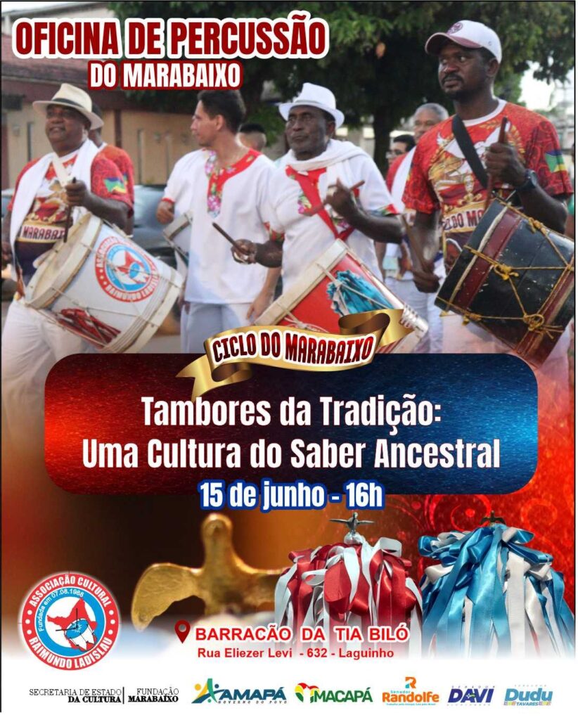 Em contrapartida à realização do Ciclo do Marabaixo, os realizadores dessa manifestação oferecem ao público a Oficina de Percussão “Tambores da Tradição: uma cultura do saber ancestral”, nesta quinta-feira (15), no Barracão da Tia Biló, bairro Laguinho.