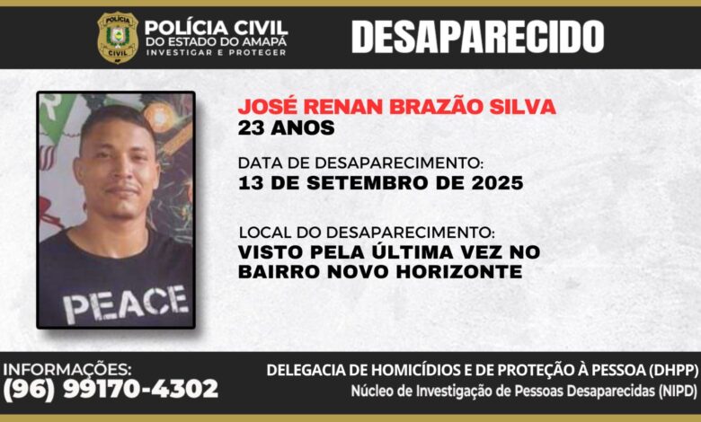 Polícia Civil do Amapá está em busca de informações que ajudem a localizar José Renan Brazão Silva, de 23 anos, desaparecido desde o dia 13 de setembro de 2025.