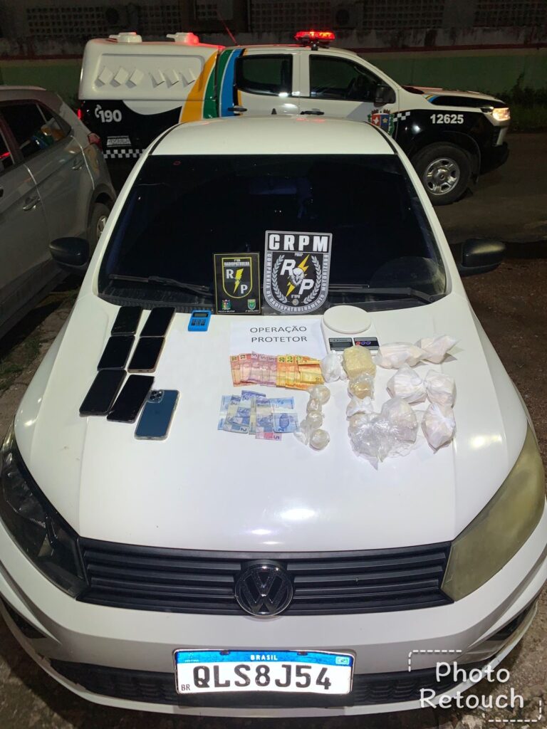 Durante a abordagem, os militares encontraram porções de crack com Renan Quaresma Oliveira e com Samara Souza Dias. Diante do flagrante, foi realizada busca no interior da residência, onde os policiais localizaram, dentro de uma mochila infantil escondida em um guarda-roupa, várias porções grandes de crack, totalizando mais de dois quilos da droga.