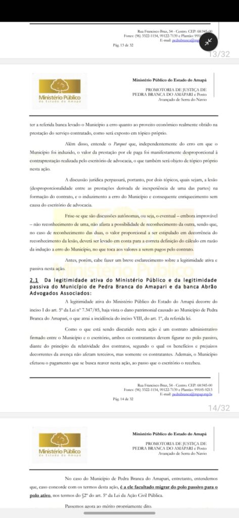 Na ação, o Ministério Público Estadual destaca que diante das informações prestadas pela Prefeitura de Pedra Branca do Amapari, Agência Nacional de Mineração – ANM e Escritório de advocacia, a referida banca teria levado o Município a erro na prestação do serviço contratado. Em reconhecimento da lesão, deverá ser levada em conta a correta definição do cálculo dos valores a serem pagos pelo contrato.