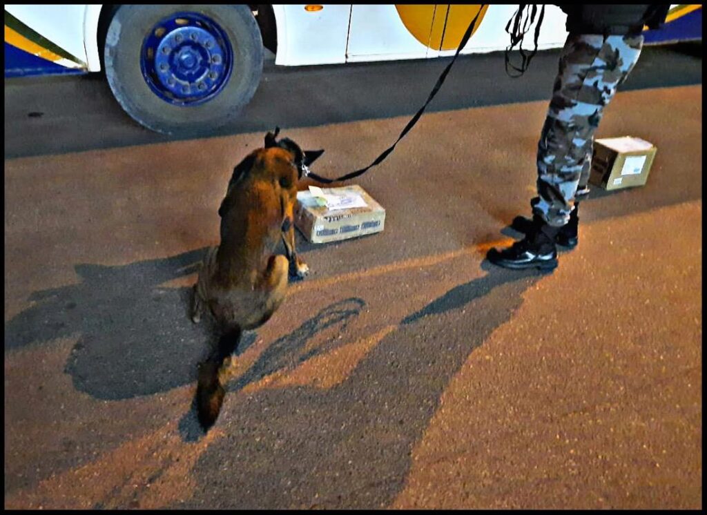 Desta vez, a ação contou com os cães farejadores do Bope Thimoty e Zeus. Foram eles que encontraram o material, durante as buscas feita no coletivo.